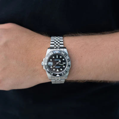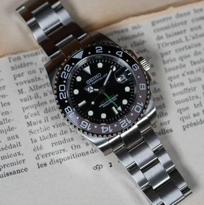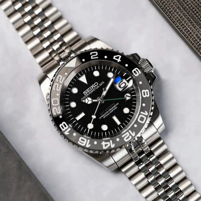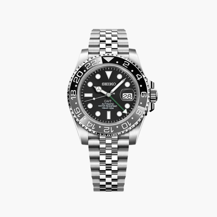 Inspired by the iconic GMT design and powered by the renowned Seiko NH34 automatic movement, we proudly introduce the Seiko Mod GMT. This 40 mm timepiece represents the perfect blend of high-end quality and accessibility, offering exceptional craftsmanship at an attainable price.