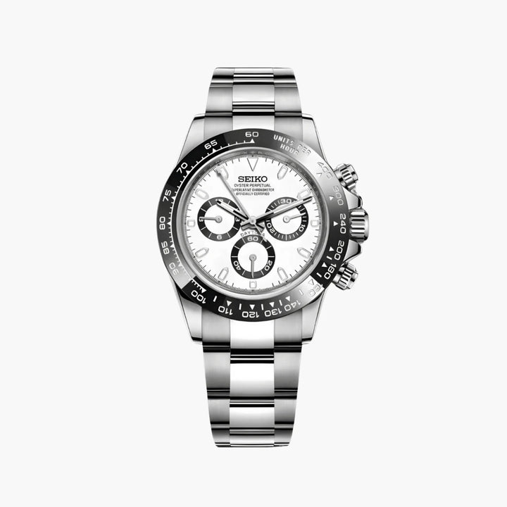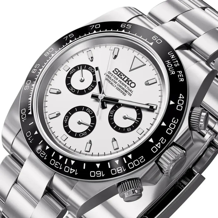 Inspired by the iconic Daytona and powered by the prestigious Seiko VK63 hybrid movement, the Seiko Mod Daytona is a 40 mm high-end watch merging excellence and affordability.
